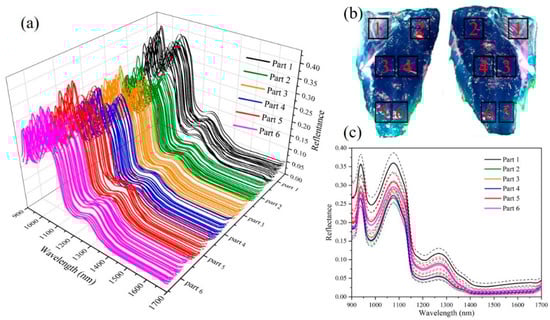 The raw reflectance spectra within the 6 parts (Figure 2b) of 22 fresh fish are presented in Figure 2a; these parts of fish are collected from back, belly, and tail. In order to clearly show the difference in the spectra of different parts of fish, the mean and standard deviation spectra of six parts are displayed in Figure 2c. Some broadband peaks occurring in the near infrared region can be well explained by the overtone and combination vibrations of the molecular chemical bonds, such as O-H, C-H, and N-H [31]. The presence of water in the pearl gentian grouper showed two absorption bands at 980 nm and 1450 nm due to O-H stretching second and first overtones [32] in Figure 2c. Besides, one absorbance peak located at 930 nm corresponded to the third overtone C–H stretching in the methylene group of fat [33], the other absorption peak around 1220 nm was ascribed to the C-H stretch second overtone of fat [34]. It was also observed that the spectral reflectance curves of samples were quite smooth with similar trends across the whole tested wavelength region. However, a remarkable difference in the magnitudes of spectral reflectance value among different parts of fish was observed. The different reflectance spectra of different parts are mainly due to the difference in fat content. The lower the fat content, the higher the absorbance and the lower the reflectivity. Generally, the natural distributional pattern of fat, increasing from back to belly, and from tail to head [35]. Parts 2, 3, and 4 are mainly located on the back and have low fat content, so the reflectance spectrum value is low. While site 1 is located in the belly, the high fat content results in a large reflection spectrum amplitude. However, fat content generally decreases from skin side to inside [35], the 5 and 6 parts of the tail may be because the fish is very thin and very close to the skin, resulting in higher fat content.
