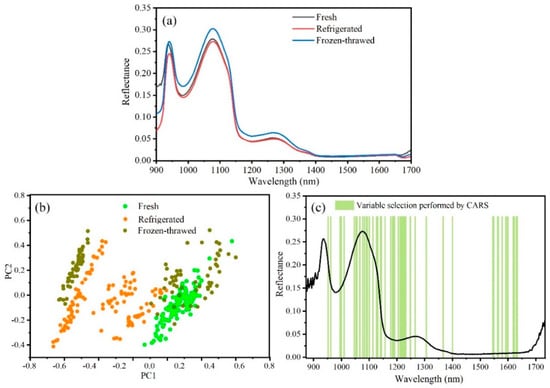 Classification model for fresh, refrigerated, and frozen–thawed fish: (a) Average spectra of fresh, refrigerated, and frozen–thawed fish; (b) classification results performed by principal component analysis (PCA) model; (c) variable selection performed by competitive adaptive reweighted sampling (CARS).