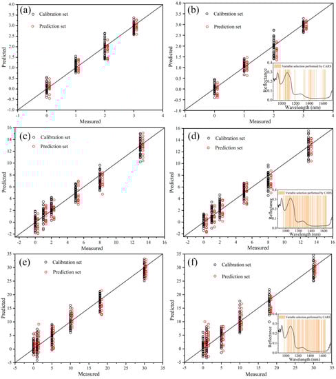Figure 4 shows the PLSR and CARS-PLSR models of storage time under three storage conditions using the entire spectrum. Figure 4a,c,d shows scatter distribution diagrams of storage time predicted by PLSR model for prediction set samples. The abscissa is the real refrigeration time, and the ordinate is the predicted time. The samples were distributed around the ideal prediction line and were relatively close to the straight line, indicating that the hyperspectral and PLSR algorithm could accurately predict the storage time of fish.