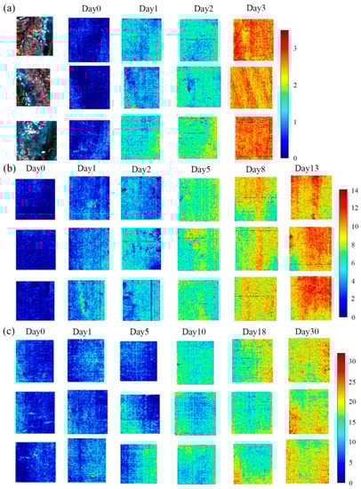 As can be seen from the linear color bar in the lower right corner of the figure, dark blue represents the shortest refrigeration time of 0 days, and dark red represents the longest storage time, 3 days, 12 days, and 30 days, respectively. The gradient from dark blue to dark red represents the extension of storage time, and different colors represent different days. In Figure 5a, from top to bottom, there were three samples stored for 0, 1, 2, and 3 days at a room temperature of 10–25 °C. The color gradually changed from dark blue to red. In Figure 5b, from top to bottom, samples were refrigerated for 0, 1, 2, 5, 8, and 13 days. The color gradually changed from dark blue to red. Figure 5c shows samples from 0, 1, 5, 10, 18, and 30 days later under freezing conditions from top to bottom. The color gradually changed from dark blue to light red. In brief, the actual storage time under the three storage conditions were basically consistent with the predicted refrigeration time corresponding to the color in the figure, indicating that the PLSR models established by the average spectrum can accurately predict the storage time of each pixel on the unknown samples.