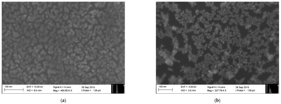 Surface Electron Microscopy (SEM) images of gold nanoparticles functionalized with: (a) 2-Mercaptobenzoxazole and (b) 4-Methoxy-α-toluenethiol.