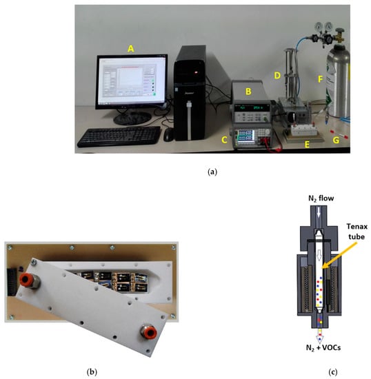 (a) Measurement setup: A—computer, B—data acquisition system, C—power source, D—thermal desorption unit, E—sensor test chamber, F—N2 gas bottle, and G—Tenax TA storage tube. (b) Inner view of the sensor test chamber with the chemical gas sensors. (c) Schematic representation of the thermal desorption unit, illustrating released fecal VOCs transported by the N2 gas flow.