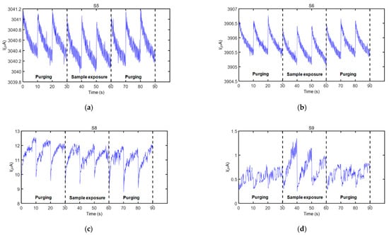 Four sensors from the electronic nose employed in this study responded to the fecal VOC samples analyzed. These sensors were S5, S6, S8, and S9 (see Table 3 for details), and their characteristic responses to a representative VOC sample are presented in Figure 3. Only the three operation periods in the active mode of the sensors, acquired during each measurement cycle, are indicated in this figure (initial purging process (first three operation periods), sample exposure (next three operation periods), and purging process after a sample measurement (last three operation periods)). Current modulation during the 90 data points acquired during every operation period of a sensor can be clearly observed in this figure.