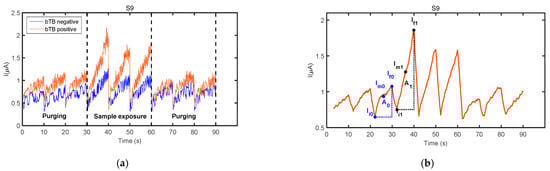 (a) Exposure of sensor S9 to the fecal VOC samples of a bTB negative wild boar (blue curve—boar #2 in Table 1) and a bTB positive wild boar (red curve—boar #12 in Table 1). (b) Parameters used to calculate sensor response features, indicated on the filtered signal of sensor S9 to the fecal VOC sample of wild boar #12. Sensor details are found in Table 3.