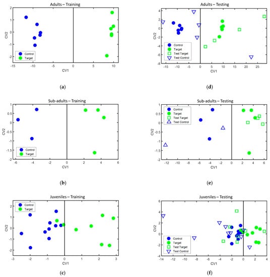 Classification models built for: (a) adult animals, (b) sub-adult animals, and (c) juvenile animals. Projection of the test samples on the classification models for: (d) adult animals, (e) sub-adult animals, and (f) juvenile animals. CV1 and CV2: canonical variables of the DFA model, calculated as a linear combination of sensor features, as described in Ionescu et al. []. Legend: control—bTB negative animals, target—bTB positive animals, filled symbols—samples used in the training phase, and empty symbols—samples used in the testing phase.