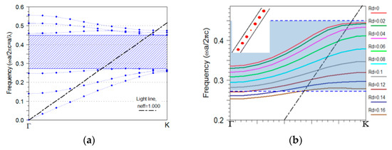 The radius of rods in one row of photonic crystal () was altered to create a photonic crystal waveguide (PCWG). The dispersion diagram of the PCWGs with different radii is displayed in Figure 1b. The supercell for PCWG mode calculation has a lateral length of one row of Si rods in the x-direction and seven rows of Si rods in the y-direction (inset Figure 1b), which is large enough to avoid the coupling between the adjacent parallel waveguides. Changing the radii of pillars in PCWG from zero to higher values shifts the waveguide mode to lower energy. Therefore, this parameter is used to tune the frequency of PCWG mode to the desired frequency range. The is chosen for this study because the PCWG is designed for CO2 sensing [19,20] Figure 2a,b presents a schematic view of the PCWG.