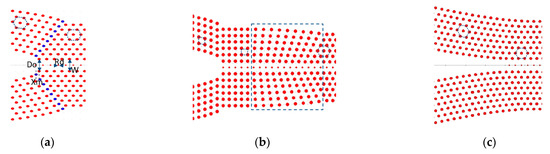 where and are the input and output width of the taper, respectively (Figure 3). Variables and define the horizontal and lateral position of the center of each rod with respect to the input of the taper, respectively. The parameter is the total length of the taper and defines the shape of the taper as follows: convex taper, linear taper, and concave taper. The innermost row of the rods is spotting according to Equation (1) to shape the taper.