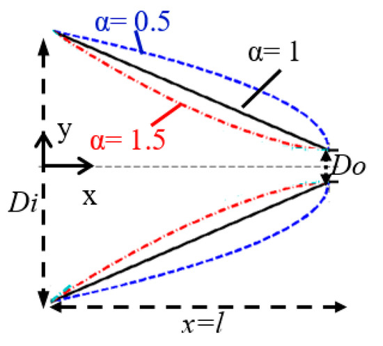 Various taper shapes for different values of . The corresponding shape of taper for and is convex, linear and concave, respectively.