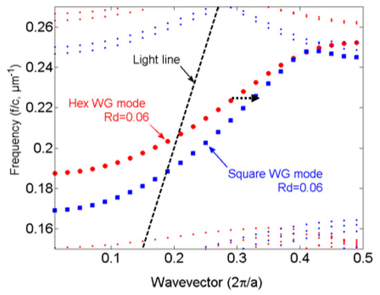 Dispersion diagram of PCWGs with hexagonal lattice (red dot) and square lattice (blue dots), respectively.