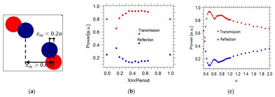 According to Equation (1), the shape of the taper is changed and the power transmitted to the PCWG for different values of α is calculated. However, the width of the convex taper (α < 1) features a rapid change when approaching the end of the taper. Therefore, close to the taper-end, the vertical distance between rods increases, which causes an in-plane radiation loss (leakage). Hence, light traveling through the taper will experience a non-adiabatic mode transformation. To address this issue an extra column of Silicon rods was added to the lattice to reduce lateral radiation loss. The extra column of silicon rods is positioned within a lattice period a, which is presented with blue dots in Figure 2a. The parameter defines the position of the most inner rod of the extra column along the -axis. Figure 5b shows the transmission efficiency of the convex taper with versus. Without the extra column () the maximum transmission is around 65%. However, by adding the extra column, the transmission efficiency improves to more than 95%, which verify reduced radiation loss. Each Si rod has a radius of R = 0.2a. For and the silicon rods in the extra column overlap with the silicon rods of the lattice as shown in Figure 5a. Consequently, some defect centers with different shapes are introduced into the lattice, which causes some anomaly radiation or reflections. Hence, the acceptable range for parameter is .