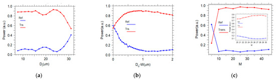 In the following, the effect of the input width, the output width, and the length of the taper on the transmission is investigated. The main function of a photonic crystal taper is the transformation from a large cross-section fiber to a small cross section PCWG [11]. Figure 7a presents the transmission power versus the input width at a fixed length and the output width. For input widths between 7 and 15 µm, the transmitted power is almost constant. However, for larger the input width, the transmitted power has some fluctuations because, at a given length and output width, there is a fast change in the width of the convex taper. Therefore, more back-reflection loss occurs. Considering conventional fibers, an input width of 15 µm is a feasible choice for this work.