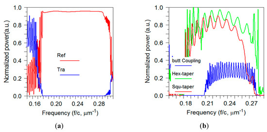 In the first place, a pulse is launched into the bulk PhC. Figure 8a presents the transmittance and reflectance of the bulk PhC. In the frequency range of 0.178–0.294 () µm−1 the transmission is highly diminished, which is expected since the pulse is placed in the bandgap. The normalized frequency is in the range of 0.276–0.455() which has a good agreement with the dispersion diagram presented in Figure 1a. This bandgap is our region of interest because working in this region reduces the coupling loss due to the bulk of photonic crystals [11]. The butt coupling together with the transmission spectrum of two types of tapers introduced in Section 2 with is shown in Figure 8b. The two tapers have hexagonal and square lattice symmetry, respectively. For a correct comparison, all three structures have a compatible length. The butt coupling has an average transmission efficiency of 25%, whereas the average transmission efficiency for the taper with square lattice is changing between 60% and 80% over the frequency range of 0.18–0.26 () µm−1. However, the transmission efficiency for the taper with hexagonal lattice is changing between 60–90% in the frequency range of 0.18–0.28 () µm−1 which is a significant improvement. As can be seen, the hexagonal taper has a wider transmission frequency range than others, besides the transmission is always higher for the hexagonal taper in all frequency range. This strongly proves the advantage of using the hexagonal array taper with respect to the square array taper.