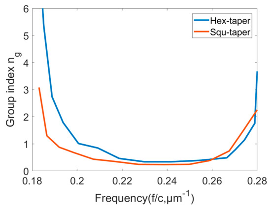 where represents the coupling length. The transmission spectrum versus the wavelength regime is used and a Lorentzian peak is fitted to each Fabry-Perot peak to deduce the parameters and . Figure 9 summarizes the deduced for two types of tapers as a function of normalized frequency (). The slope of the group index curve shows the group velocity dispersion (GVD). A mode with low group velocity (namely, high group index) is usually accompanied by large GVD, which would severely limit the bandwidth of slow light, deforming optical pulses [23]. Generally, the wavelength range over which the group index remains constant is considered as the useful bandwidth of the device, and in many papers, the group index is considered as constant when the fluctuation of it is within a ±10% range [24,25]. In the lower frequency range, the slope of for the square taper is smaller as compared to the hexagonal taper resulting in better transmission. However, the useful bandwidth range of the square taper is 0.207–0.259() µm−1, and the hexagonal taper is 0.2187–0.2665() µm−1, which shows that the square taper has a wider useful bandwidth than the hexagonal taper. In the case of slow light, the confinement of light is increased, which leads to high photon density, in other words, effective light-matter interaction is enhanced as becomes large [22]. In the marginal region of the spectrum, the group index has higher variations for the hexagonal taper, which make it particularly suitable for sensing applications utilizing low group velocity [20,21].