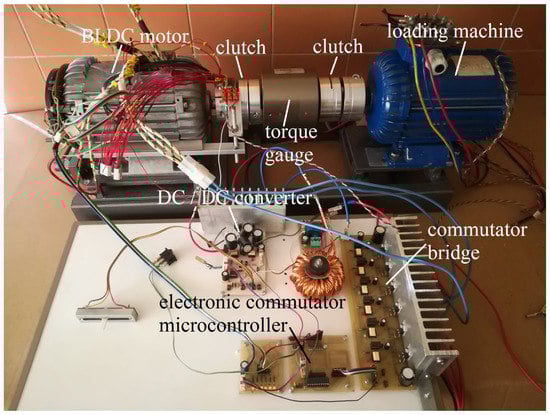 It was decided to test the designed and manufactured BLDC motor power supply on a laboratory stand that allows for setting the load torque. The schematic diagram of the measuring stand is presented in Figure 1.
