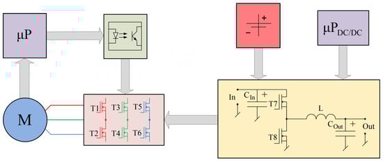 In order to reduce the difference between the average value and the effective value, the DC/DC converter and the program of the microcontroller controlling the DC/DC converter were modified. In order to ensure the possibility of current stabilization during one cycle of power supply to the motor, the capacitive filter located behind the DC/DC converter () was removed from the converter. The converter has been extended with a system generating a signal proportional to the average value of the motor supply current and a system which, based on this signal, controls the power transistors of the DC/DC converter (T7 and T8). These transistors also perform the function of speed control of the drive through PWM modulation. On the other hand, the electronic commutator transistors (T1–T6) are opened only on the basis of information about the rotor position (no PWM modulation). Later in the article this system was called the modified system.