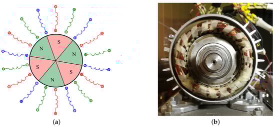 Rare earth magnets allowed for the construction of more efficient and reliable electric motors [1,2,3]. Magnets in modern electric motors are used to create the excitation flux [4]. Classic motors (earlier motor designs) used an excitation winding to generate the magnetic flux, which required a DC supply [5]. Powering the excitation winding (used in earlier designs) generated electricity losses resulting from the flow of the excitation current of the electric machine [6,7]. The loss of electrical energy causes the excitation winding to heat up, thus increasing the temperature of the electrical machine [8]. The elimination of the excitation winding, which causes electric energy losses due to the excitation current flow, made it possible, thanks to the use of modern magnets, to reduce the size of the electric machine while maintaining the same power, or to make the electric machine of the same dimensions with greater power [9,10]. Permanent magnets can be placed on the stator of the electric machine, then it is necessary to use a mechanical commutator as in classic DC machines, such solutions are used, for example, in automotive starters excited by permanent magnets [11,12]. Another solution is to place permanent magnets on the rotor of the machine [13,14]. This solution eliminates the mechanical commutator, which causes frequent failures of DC machines [15,16]. Electric machines with permanent magnets placed on the rotor are divided into two types: