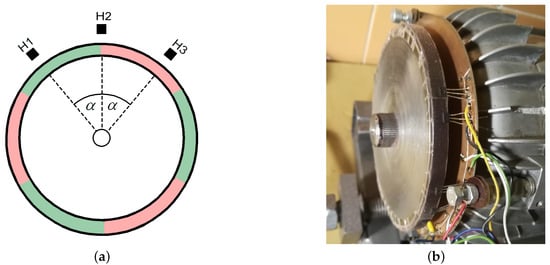 The sensor in Figure 5 was made with such an angular arrangement of the Hall effect sensors to determine the rotor position necessary to change the control sequence. Hall effect sensors were placed on the outer disc so that they were in the magnetic field of a six-pole disc with glued permanent magnets mechanically coupled to the motor shaft. The external magnetic transmitter was made in such a way that the gap between the magnets was minimal.