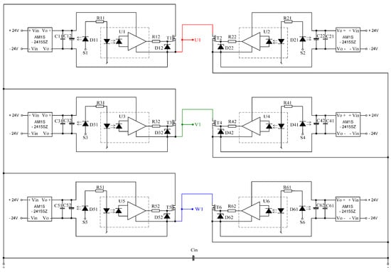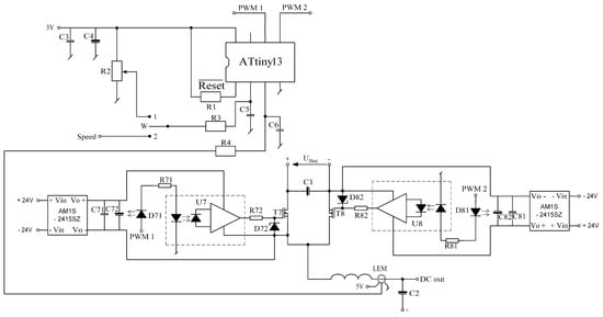 These transistors were selected for the motor’s power source, which consists of a battery of four series connected batteries with a rated voltage of 12 V. The selection of transistors was guided, in addition to their maximum blocking voltage, also the conduction resistance, which for this type of transistors is 8 mΩ, and their housing (dimensions). Moreover, for proper operation, galvanic isolation between the microcontroller system and the power transistors (IRF3205) is necessary. This insulation is required due to the different potentials existing on the individual windings of the motor during its operation. As elements of galvanic isolation on the stand, TLP351 optoisolators with a maximum collector-emitter voltage of 30 V were used, which is sufficient to fully open the IRF3205 transistor used. LED diodes installed on the input side of optoisolators are powered by resistors limiting the current from the output pins of the microcontroller. On the other hand, the output side of the optoisolators controlling the power transistors requires an individual power source, and the stand constructed as such sources used converters with a power of 1W type AM1S-2415SZ. These converters are 24 V powered and each converter supplies the voltage required to power each of the transistors individually. Such configuration was used both in the electronic commutator system and in the converter system used to lower the motor supply voltage. The schematic diagram of the converter is presented in Figure 12.