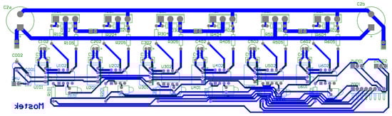 The operation of the brushless motor is based on a given sequence of voltages supplying individual windings. This sequence for a given direction of rotation clearly depends on the angular position of the rotor. The control system of the windings of the three-phase BLDC motor is powered by a system of six transistors operating in a three-phase bridge system. Transistors working as power electronic keys are controlled by a microprocessor system. Control is based on signals from three hall sensors. These sensors were arranged in such a way as to use their signals to determine the position of the rotor, which corresponds to one of the six power sequences. The system of transistors together with the control system is commonly called an electronic commutator. The schematic diagram of the electronic commutator bridge made by the authors is shown in Figure 6, while the photo of the electronic commutator is shown in the Figure 7. Additionally, Figure 8 shows the PCB design on the basis of which the tested electronic commutator bridge was made.