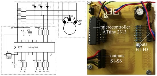 The control unit is the ATtiny 2313 microcontroller, which reads signals from a system of hall sensors cooperating with a magnetic target with the same number of pole pairs as the motor rotor. Depending on the signals supplied from the system of three hall sensors, the microcontroller works out the appropriate sequence of power transistors of the IRF3205 (T1–T6) type with rated parameters 55V and 80A (Figure 7). Figure 11 microcontroller implementation diagram.