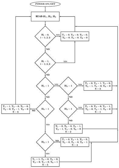 Block diagram of the microcontroller program controlling the power supply of the bridge, where , , is the input signal from Halls, state of the transistors, and where 1 means open and 0 closed. The S variable represents one of the six possible states of the engine control sequence.