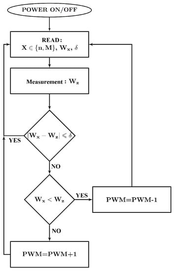 The converter consists of two mosfet transistors, which are controlled by drivers with a signal supplied from a microcontroller. The ATtiny 13 microcontroller was used as a microcontroller for the converter. Such a microcontroller was chosen because it has analog-to-digital converters and two PWM signal channels. One of the analog-to-digital converters is supplied with a signal from a control potentiometer or an external system that sets the motor supply voltage. This signal corresponds to the desired value of the output voltage, ranging from 0 to the supply voltage supplied from the battery bank . The converter microcontroller generates a PWM signal with such filling that the average value of the PWM signal corresponds to the set value of the motor supply voltage. The signal from the microcontroller is sent to the optical insulation system, and then the power transistors are switched on. The converter microcontroller, using a second analog-to-digital converter, also measures the current consumed from the converter, thanks to which it is possible to control the current flowing in a safe range, protecting the converter and the motor against overheating or damage due to overload. The converter is based on two identical power transistors with their control systems. These transistors work in such a way that when one is open, the other is closed. This solution allows not only to supply the engine with reduced voltage, but also to recover energy and return it to the battery during braking. During normal operation, when the motor is powered from the battery, the converter reduces the voltage supplied to the motor, while during braking, the converter increases the voltage supplied from the motor windings, which enables charging the battery with a voltage higher than the voltage obtained from the motor windings. In both cases, the converter current is measured and taken into account in the control to protect against damage. Moreover, by using the possibility of switching the source of the motor supply voltage reference thanks to the W switch, instead of setting the signal from the potentiometer, it is possible to set a signal from an external system. This solution allows for the implementation of the engine spin speed stabilization system. The block diagram of the microcontroller program realizing the spin speed stabilization is shown in Figure 15.
