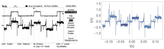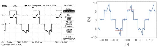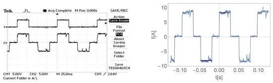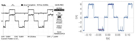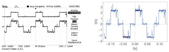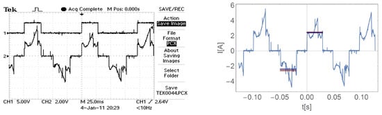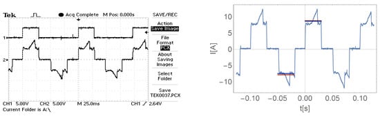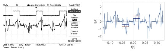 Figure 16, Figure 17, Figure 18 and Figure 19 show the current waveform for single cycles (current flow in both directions) of the motor supply. Each of these figures features an oscillogram, which, apart from the current waveform, also shows the duration of the power sequence. The figure on the right shows the mean value for a single measure (blue line) and the effective value of the current (red line), while the effective value is shown with a sign of the mean value for better comparison.