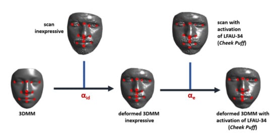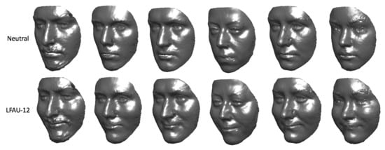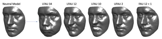 From a physiological point of view, facial expressions can be seen as resulting from the contraction of facial muscles that deform the visible skin tissue. Usually, the type and intensity of facial expressions depend in a complex way on the level of activation of several muscles and their combined effect. Looking to the deformation of individual muscles or combination of them, Ekman and Friesen defined the Facial Action Coding System (FACS) [] that relates facial expressions with the activation of Action Units (AUs), i.e., deformations of individual muscles. Both expression recognition and AU detection have been addressed in the literature using either RGB images or 3D data. The most common solution is that of recognizing and classifying the facial movements by analyzing the variation between neutral and expressive faces of some face features. In case of RGB imagery, these are extracted from the texture and are meant to describe appearance changes as induced by the facial deformations. In 3D, they instead capture changes occurring in the geometrical structure of the face surface. In both the cases, it is possible to use those features to discriminate between deformations that induced specific appearance changes. In other words, given a sample face, either in the form of RGB image or 3D data, we can observe the sample and decide which process, i.e., muscular movement, generated the particular appearance. However, operating this way we do not gather knowledge on the generative process itself, and so cannot replicate it. A way of addressing this problem would be that of directly analyzing the motions induced by AUs rather than what changes they determine on the face. Clearly, using 3D data is necessary to this aim, and would allow a direct evaluation of geometric deformations in the 3D space where they actually take place, rather than from their 2D projection in RGB images [].