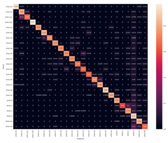 In this section, we evaluate the differences between the SLC and PCA components, which significantly differ in terms of type of deformation; SLC applies sparse and localized deformation, while PCA has global support on the face, and each component moves all the vertices of the 3DMM. Confusion matrices for PCA-50 and SLC-50 are reported in Figure 2 and Figure 3, respectively. Each row of the confusion matrix represents instances in the actual class, while each column represents instances of the predicted class. Therefore, a more accurate classification is represented by a confusion matrix with the diagonal line that has the higher percentages, but it can provide useful information on the behavior of the classifier. For example, tests indicate that LFAU-12L gets a little confused with the LFAU-12, which is plausible as both concern the lip corner puller, the first one being the asymmetric left lip corner. It turns out in this case that the SLC components, thanks to their sparse nature, better capture such slight difference and provide more accurate detection. The same occurs for UFAU-1, or Inner Brow Raiser, and UFAU-2, or Outer Brow Raiser, which get less confused when using the SLC components. We finally note a generally lower accuracy for the UFAU-44, or Squint. For this particular action unit, we find the absence of surface details in the eyes region of the 3DMM a potential source of error in this case. Examples of these are shown in Figure 4. In particular, the reader can appreciate the very slight differences occurring between the set of action units involving the eyebrows, which is most evident for the sole 3D shape.