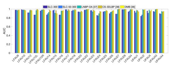ROC-AUC for each action unit, the different models (PCA-50, SLC-50, SLC-300), and the fusion of their coefficients (SLC-PCA 50, SLC 50–300). Results are compared with respect to the state-of-the-art.