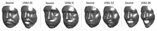 Examples of synthetically generated AUs on scans from FRGCv2.0. The neutral scan of different subjects is deformed with AU-specific coefficients: LFAU-25—lips part, UFAU 4—eyebrow lowerer, LFAU 12—lip corner puller, LFAU 26—jaw drop.