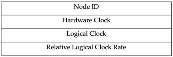When a node receives synchronization messages from its neighbor nodes, it may update its time information to an average or a consensus value of the received time information. Alternatively, it can be synchronized to the time of a specific node []. For instance, if node i determines to follow the clock of node j, the absolute logical clock rate and logical clock of node i must be modified to the values of node j. Accordingly, and should be achieved by adjusting and as shown in Equations (8) and (9).