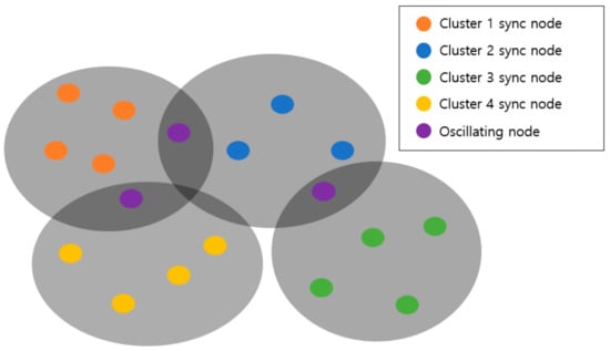 However, directly adopting a medium of logical clocks from among neighbor nodes can cause a problem. Since each node selects a medium node from among its own 1-hop neighboring nodes, if the nodes of a MANET are distributed over a large area, the logical clocks of the selected mediums will be different depending on the geographic location of each node. Accordingly, oscillations may occur in exchanging the selected medium logical clocks at each synchronization round. For instance, as shown in Figure 3, there are four clusters represented as gray areas. The clusters with orange nodes and blue nodes have a single intersection node colored purple. This purple node can be synchronized to the cluster with orange nodes at one round, and it can be synchronized to other cluster with blue nodes at some other round. This causes oscillation to the purple node. As many rounds pass, this oscillation will be diminished; however, if the nodes are deployed over a wide area, the convergence will take a much longer time. These oscillations hinder the synchronization and slow down the convergence. Therefore, instead of adopting the logical clock of the selected median node, Fast-median (F-Median) is proposed. F-Median selects the fastest logical clock within a certain range, where the range is centered at the logical clock of the medium node and has a predefined span. F-Median can reduce the oscillation while excluding outliers.