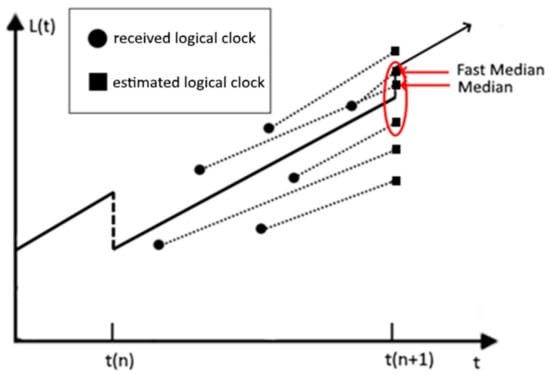 Figure 4 depicts F-Median in the nth synchronization round, where is the start time of the nth synchronization round, black circles are the received logical clocks, and the black squares are the estimated logical clocks at the synchronization round boundary.