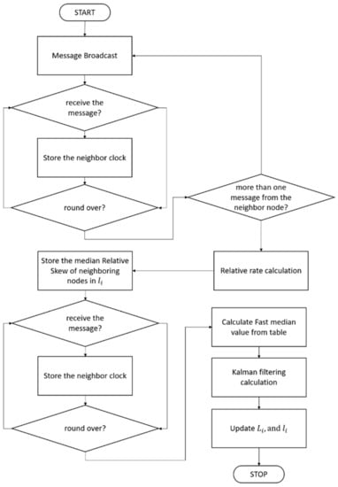 The synchronization process is repeated every round to optimize the predicted data and covariance and to remove errors caused by noise and delay. In practical protocols, the synchronization round has the same period with beacon transmission period, and some portion of the super frame is allocated to time synchronization message exchanges. A flowchart showing the whole synchronization process is depicted in Figure 5.