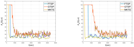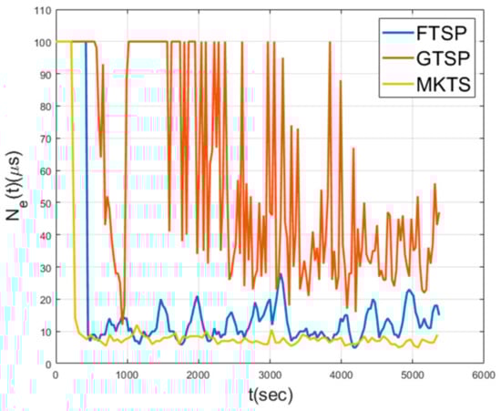 For the mesh topology, the convergence times, i.e., the times taken in achieving , are in the increasing order of MKTS, FTSP, and GTSP. In addition, the average s for these schemes are 12.13 , 15.11 , and 16.26 , respectively. A similar performance is maintained for the random topology. Note that MKTS achieves the best performance both in the convergence time and under the static environment.