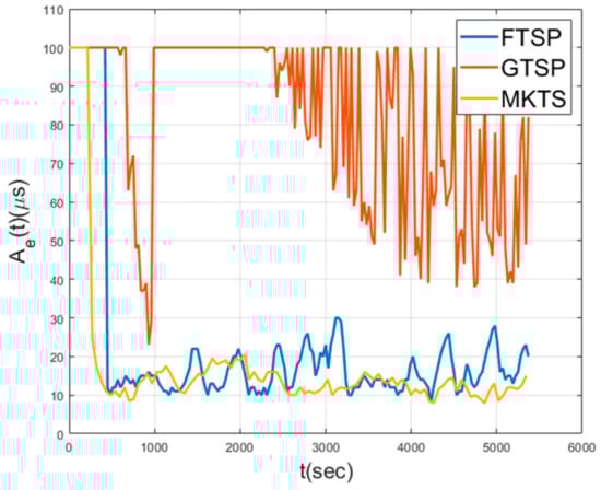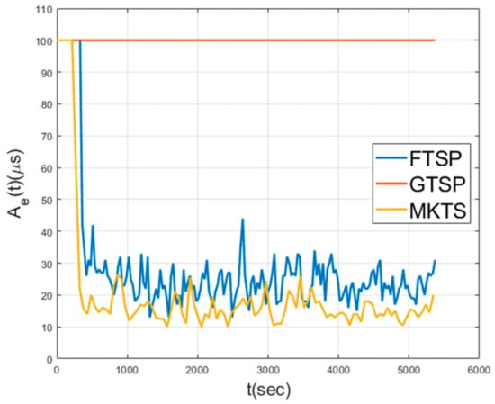 Figure 8 shows s in a mobile environment, where the nodes move at a speed of 5 m/s in random directions. As shown in this figure, GTSP fails in achieving the synchronization, because the members of a set of neighboring nodes change too quickly for the averaged clock value to converge. Since FTSP synchronizes with the clock of the reference node, even when the network topology is changed, it can achieve synchronization. However, note that the average is 28.7 , indicating that the performance decreases by 76% compared to the performance under static environment shown in Figure 7. The average of MKTS is 15.73 , which is much better than FTSP. Moreover, the performance decrement of MKTS compared with the static environment is 23%; therefore, it is clearly better than FTSP. In general, under a mobile environment, the decrease in the synchronization performance is inevitable because neighboring nodes may be changed in every round. However, MKTS minimizes this performance degradation by effectively excluding outliers using F-Median and by reducing clock estimation error using Kalman filtering.