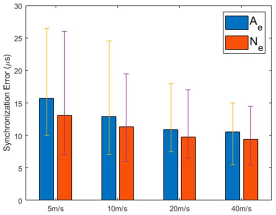 Figure 10 shows and of MKTS in a mobile environment. This figure shows that the synchronization performance is maintained even when the speed of the nodes increases. If the size of the area, where the nodes are deployed, is not large, the increasing the speed of the nodes can be beneficial in achieving the synchronization as shown in this figure. However, if the area is very large or has no boundary, as the speed of the nodes increases, the synchronization performance decreases. For instance, in an environment in which there is no boundary of limiting the movement of nodes, the higher the speed of random walking nodes, the more prone the radio link among the nodes is to be broken, resulting in a decrease in the synchronization performance.