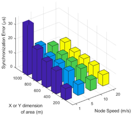 and for random walking without boundary is depicted in Figure 11. In this figure, the nodes are static until 600 s achieving time synchronization, after 600 s, the random walk starts. Figure 11 shows that the slower the speed, the longer the synchronization is maintained. In addition, if the speed of the nodes is high, the nodes within the synchronization boundary quickly leave it, and the synchronization performance decreases rapidly. Figure 12 shows the performance according to the various area size and the node speed. It is inversely proportional to area size and proportional to speed. As the range of the nodes’ movement gets smaller, the amount of the exchanged time synchronization messages is maintained at a high level. If the nodes are deployed over a bounded area, as the speed of the nodes increases, the probability of a node getting out of the synchronization group increases.