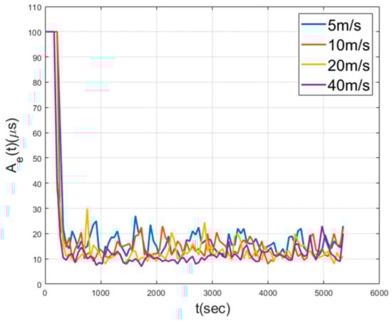 If the maximum is very high, the averaging is as good as being taken over by very many previous s, and the impact of the current will be marginal. Accordingly, a high results in a good performance in eliminating error; however, too high may result in the deterioration of catching the actual changes of like clock rate changes from ambient temperature change, which should be reflected as not being filtered out. In selecting the maximum , FTSP, which adopts least square method using 4–8 previously received messages is referred. Since the proposed method is focused on mobile scenarios, relatively small is selected as a maximum value.