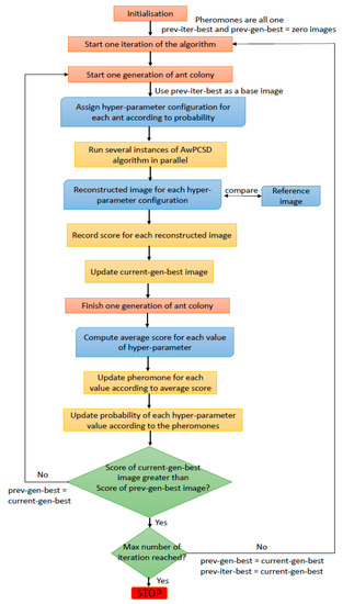 where is the average score of all ants choosing the choice i of hyperparameters, τim is the pheromone of the choice i of hyperparameters for the mth generation of ants and σ is the pheromone evaporation factor with a value between 0 and 1. The values of pheromones are normalised between 0 and 1. The pheromone for each choice of hyperparameter is updated based on the score obtained from the reconstructed image. This is to ensure that the choices which produce a highly-scored reconstructed image attract more ants in the next generation of ant colony. Then, two conditions are checked. The first condition checked is whether the score of the current-gen-best image is greater than that of the prev-gen-best image. If the answer is no, the algorithm launches another generation of ant colony replacing prev-gen-best with current-gen-best. If the answer is yes and the maximum number of iterations is not reached yet, the algorithm launches the new iteration and replacing prev-iter-best and prev-gen-best images with current-gen-best image. Apart from these two conditions, the stopping criteria as explained in Equations (8) and (9) are also checked for each reconstructed image. If these stopping criteria are met, the algorithm is stopped. Otherwise, the whole process is repeated until the user-defined maximum number of iterations is reached. At the end of the implementation, the hyperparameter configuration with the highest score is an optimal hyperparameter setting for a given data. Furthermore, the reconstructed image from this setting is obtained as an optimal result from the AwPCSD reconstruction algorithm.