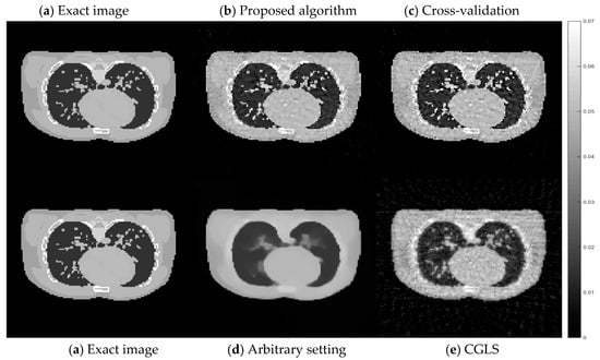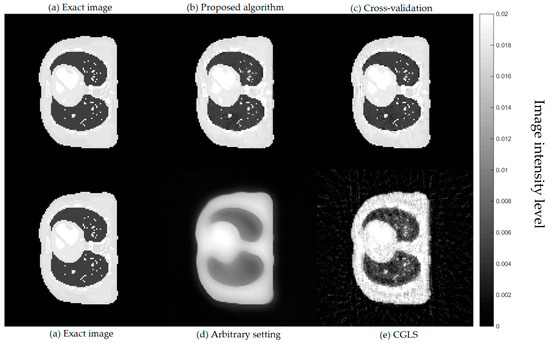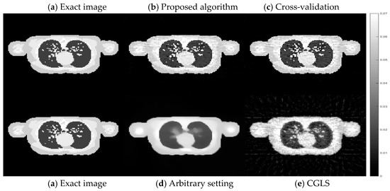 Comparing the computational time for all four cases, the CGLS algorithm is the one with the shortest time as it only takes a couple of seconds to finish its 15 iterations. For the AwPCSD algorithm with the arbitrary setting of hyperparameters, it takes approximately 2 min. The hyperparameter learning process using the proposed algorithm takes approximately 1.45 h to finish. The cross-validation algorithm is the one with the longest computational time. It takes approximately 47.15 h to finish the entire process. Cross-sectional slices of the reconstruction results from all cases are shown in Figure 4, in comparison with an exact phantom image.