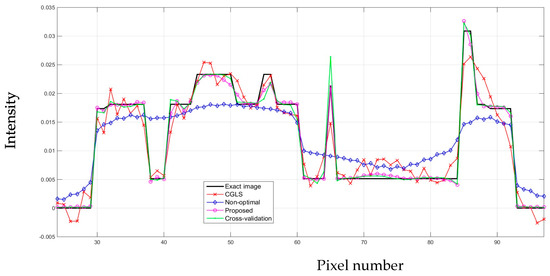 From a visual inspection of Figure 4, the reconstructed image from the proposed algorithm and the cross-validation method are rather similar to each other. Not much outstanding difference can be observed in the images from both cases. However, they are ones that are the most similar to the exact phantom image, as they contain sharper edges than the blurry result from the arbitrary setting. Even though the CGLS algorithm is able to recover small features as well as edges, the image is relatively noisy compared to the result from the proposed algorithm and the cross-validation method. To make a comparison clearer, we analysed one-dimensional profile plots of all the results along an arbitrary row of a cross-sectional slice as shown in Figure 5. The 1D plot of all the results is shown in Figure 6, in comparison with the reference exact phantom.
