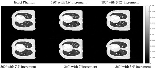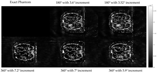 The difference images between the cross-sectional slices in Figure 8 and the exact phantom are displayed in Figure 9 to better observe the differences in each case.