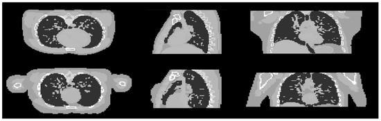 In this work, datasets from the digital 4D Extended Cardiac-Torso (XCAT) Phantom [16,17] were used in the experiments. The thorax anatomy structure of the phantoms was selected to show the performance of the proposed algorithm. Three datasets simulated from the XCAT phantom were used for training and testing purposes. For the training, one dataset was used as shown in Figure 2. The chosen voxel size is 128 × 128 × 128.