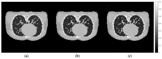 Cross-sectional slices of (a) the exact image, (b) the reconstruction from the proposed method directly implemented on the female phantom data, (c) the reconstruction using the set of hyperparameters from the training dataset. The display window is [0–0.07].