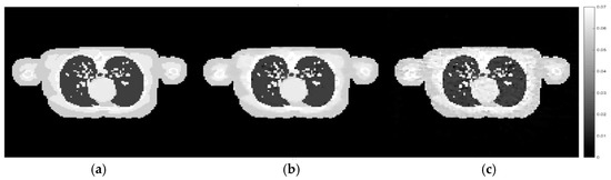 The AwPCSD algorithm was used to reconstruct the images by taking each of the noise level cases as an input. Cross-sectional slices of the reconstructed results in all cases are shown in Figure 7.
