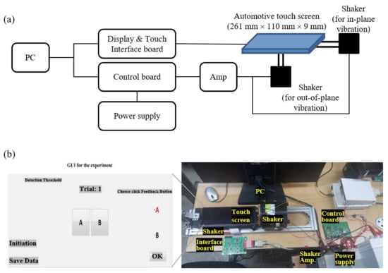 Figure 1a illustrates the experimental setup for these experiments. The display used for the experiments herein was an automotive full high–definition resolution liquid crystal display (LCD; total dimensions: 261 mm × 110 mm × 9 mm; active area: 255 mm × 103 mm; and weight: 310 g). To drive the display, an interface board transmitted the digital visual interface (DVI) to a personal computer (PC) and a low-voltage differential signaling interface to the LCD. For the timing of application regarding the haptic feedback, information from the touch sensor embedded in the display was used. If the recognized information was transmitted to the PC from those sensors, the PC generated the image information by comparing the touch gesture (location and time) with the GUI location (Figure 1b), drove the display through the interface board, and commanded the haptic stimulation reproduction through the control board. The haptic commands generated by the PC controlled the on/off, offset, frequency, and a repetition period of the signal from the microcontroller unit of the control board and amplified them using an external amplifier to the voltage required for the vibration shaker. Brüel & Kjær model 4809 was used as a shaker, and the amplifier was Brüel & Kjær model 2718. A shaker was fixed to the center of the display’s back to generate the out-of-plane (the normal direction) vibration of the display. The other shaker was placed horizontally beside the short side of the display and fixed to the display device to generate the in-plane (the tangential direction) vibration (Figure 1b).