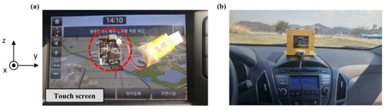 Measuring setup of driving vibration on the touch screen in vehicles. (a) E2BOX’s EBIMU24GV3. (b) Crossbow’s VG700CB-200.