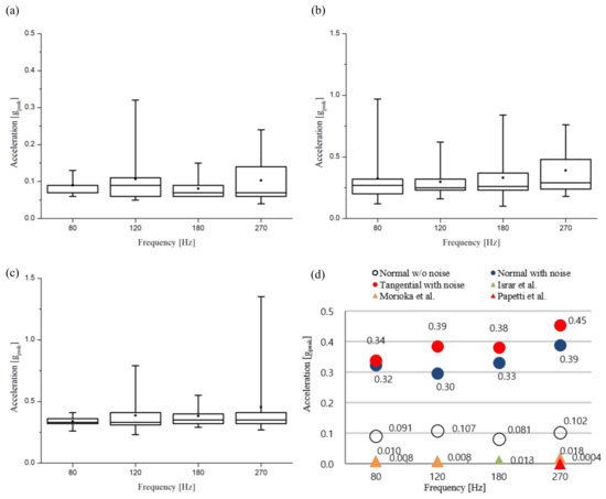 Experimental results of the detection threshold expressed as acceleration. (a) For the normal direction without driving vibration. (b) For the normal direction with driving vibration. (c) For the tangential direction with driving vibration. (d) Comparison of experimental results and previously published data.